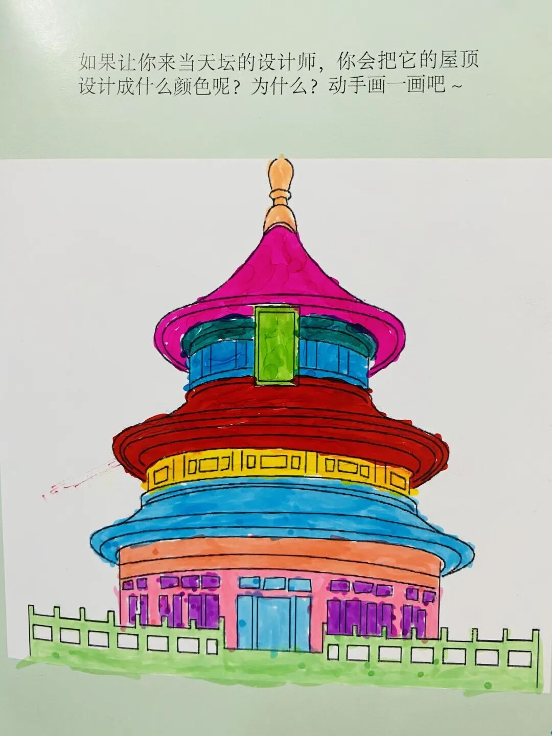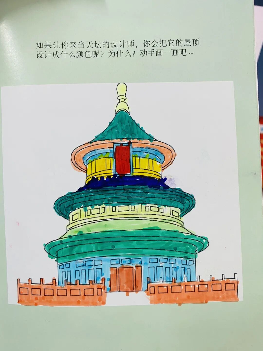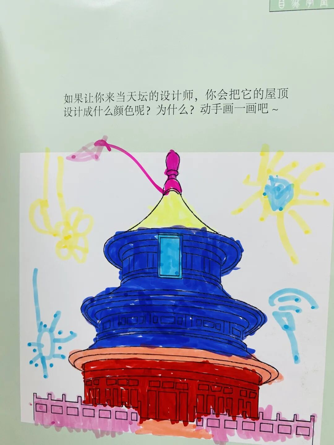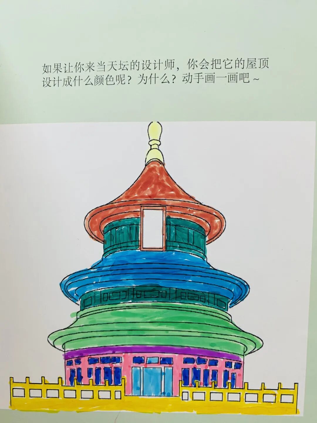 在老师精心设计的天坛图册里,孩子们对比观察祈年殿古今颜色的变化,迫不及待地在手册上设计出属于自己的祈年殿。