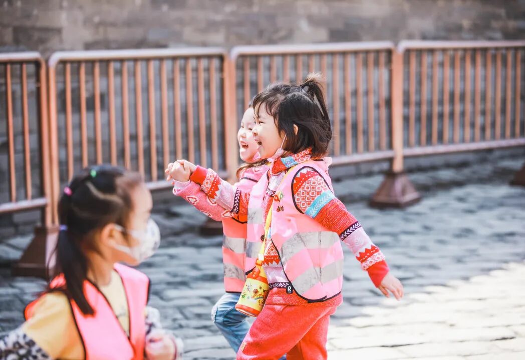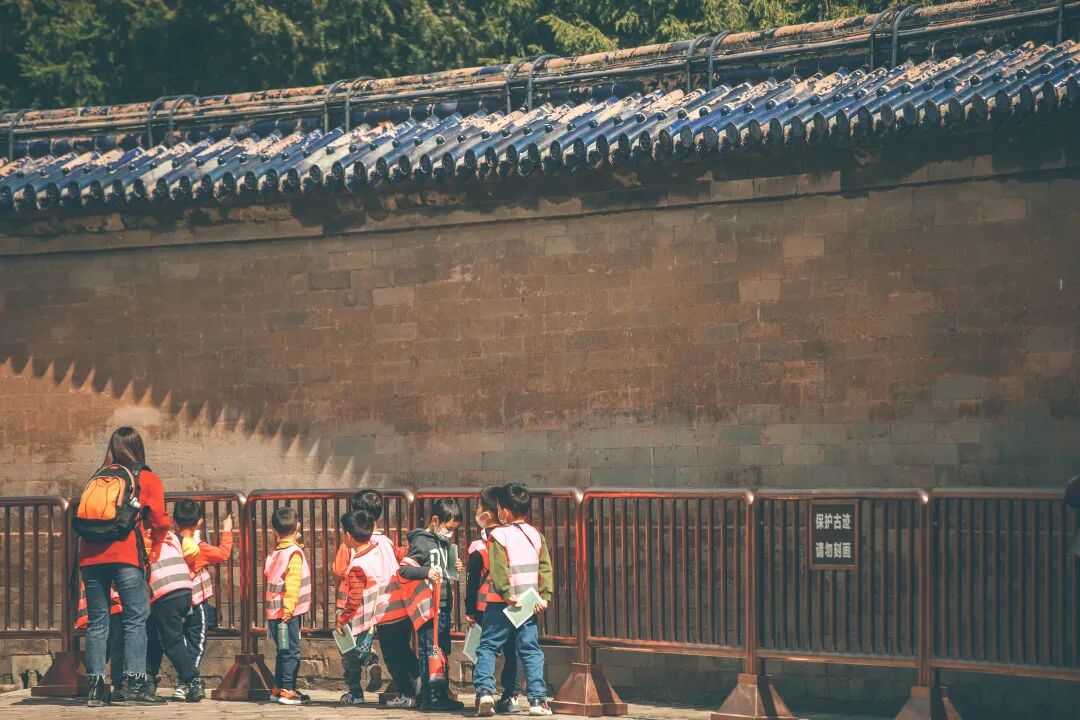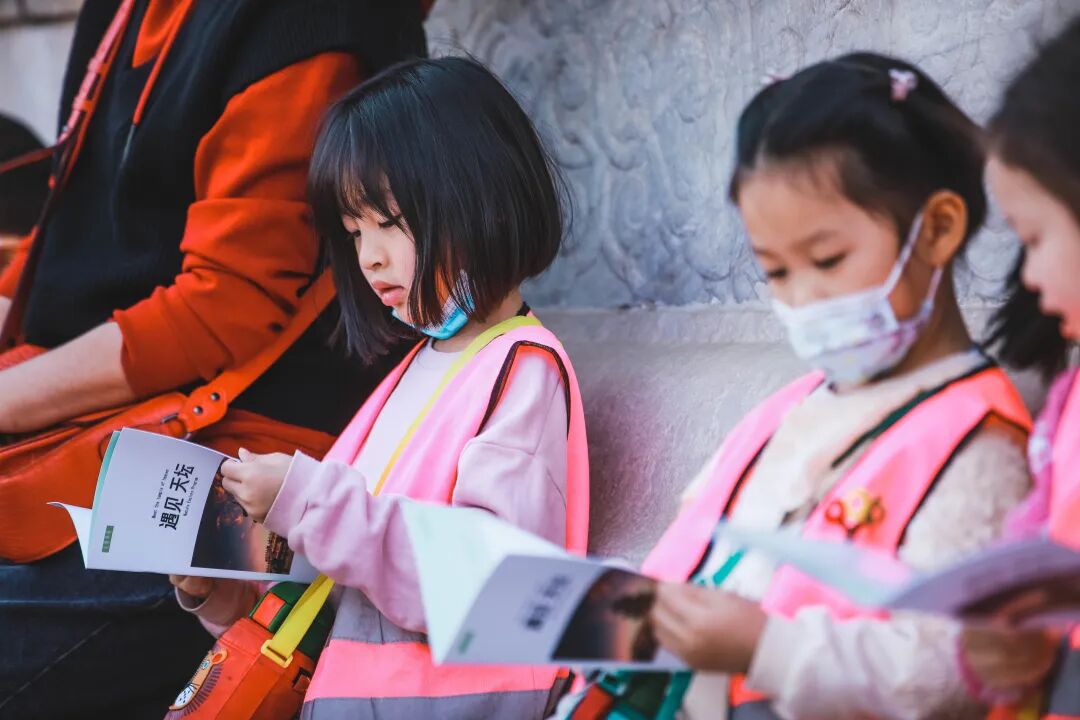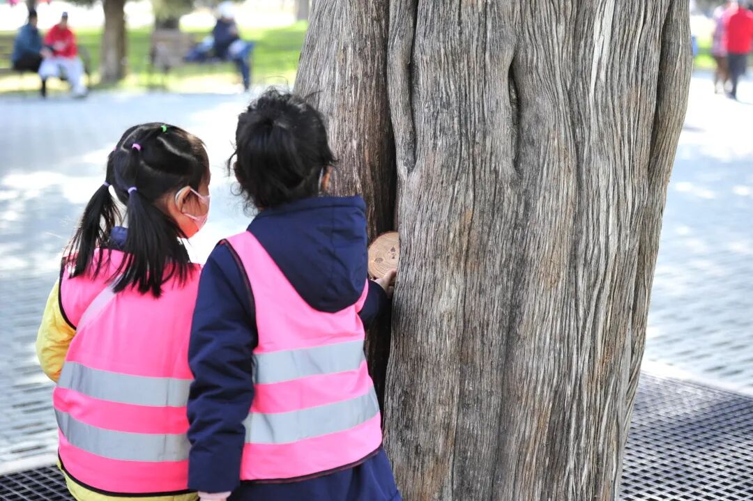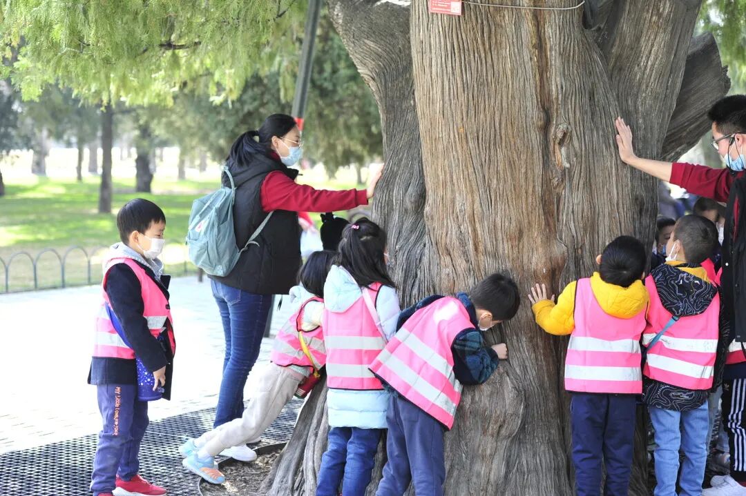 孩子们一起触摸粗糙的树皮,感受生命的绵长。在环抱树干时,有棵古树居然需要6个小朋友伸开手臂才能环抱起来,大家由衷感叹树爷爷的年龄,猜测它的年轮应该会有很多很多圈!