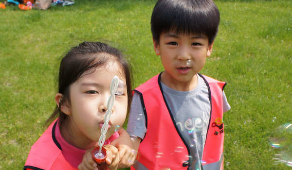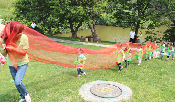 天朗气清、山青水秀,我们走过周边是青翠草丛的石子路,小心翼翼地踩过潺潺流水之上的石板桥,孩子们特别开心,我们最终停留在了一处草地上。平旷宽阔的草地很自然的勾起了孩子们踢球的欲望,大家开始在草地上奔跑起来……起初,我们踢得带劲,可旁边欢快的笑声扰乱了我们的球赛。