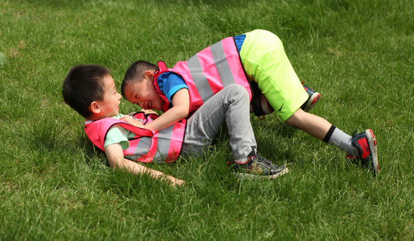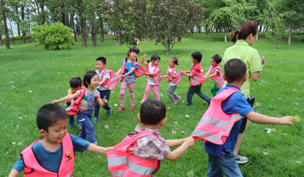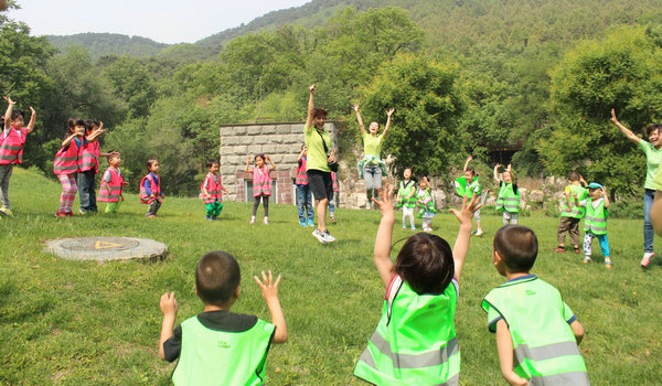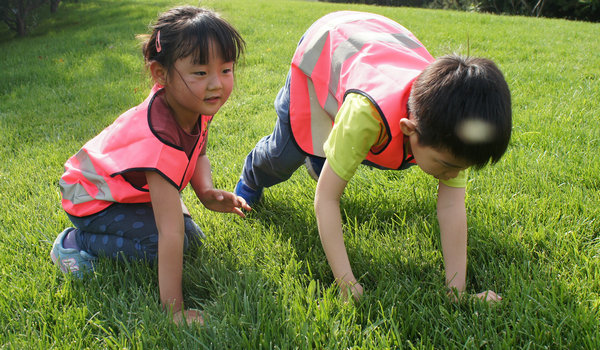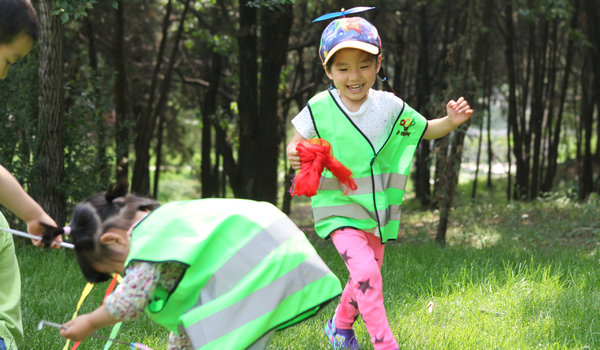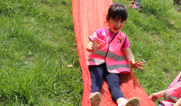 紧接着,我们又拉手跑、竞技跑、我抱着小朋友(双臂抱住小朋友身体)“滚”下来……酣畅淋漓之后,我们休息喝水,然后又在草坪上追逐起来。孩子好像和大自然有着天然的连接,他们对这一切并不顾虑和陌生,完全放开了,和大自然热闹亲昵起来。