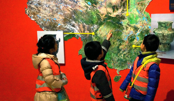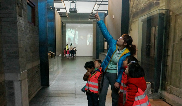 等到了首都博物馆五层的“老北京”展厅,孩子们早已把“炸酱面”忘到了脑后,立马被惟妙惟肖的模型吸引住了。原来,这个展厅是以北京建都八百多年的皇城为背景,装饰成了最具北京民俗特色的胡同和四合院。孩子们坐在四合院的台阶上,听老师讲解老北京的风俗,还在胡同里看到了很多北京传统民俗的模型,有“舞狮辞旧岁”、“八抬大轿”、“祝寿宴”、“吹糖人儿”、“逗蛐蛐儿”、“拉洋车”等。
